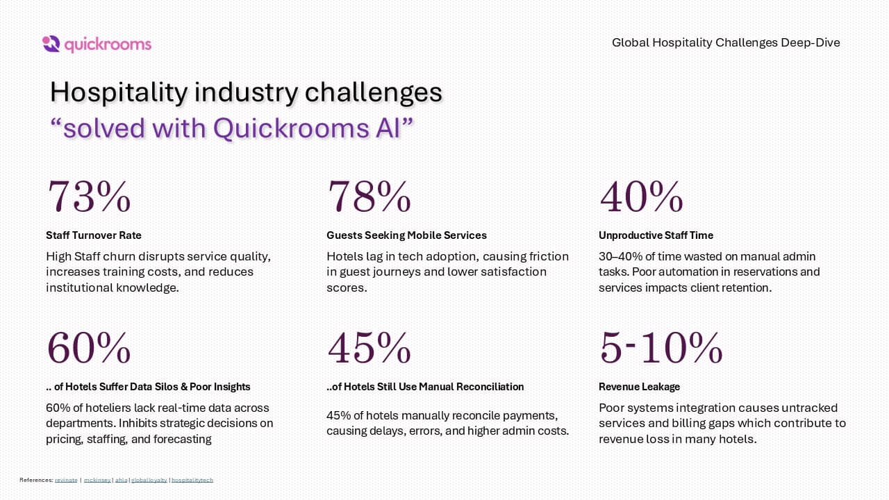 Hotel operations face two critical challenges: a severe staffing shortage and fragmented technology. The American Hotel & Lodging Association reports 67% of hotels have staffing gaps that hurt service. At the same time, 40% of hoteliers say their biggest obstacle is disconnected systems.